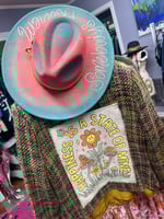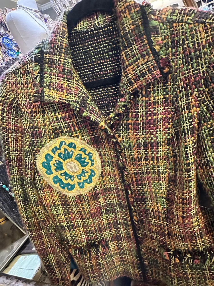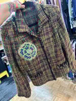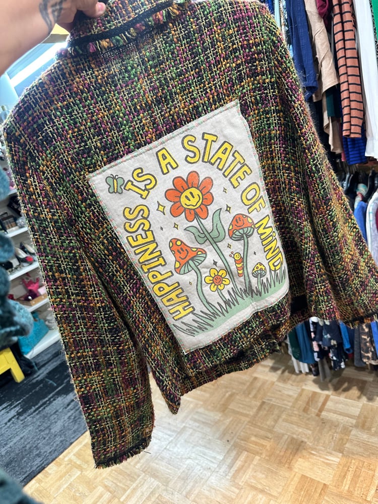 COMING SOON! GORGEOUS CUSTOM BLAZER WITH A FUN POSITIVE PRINT ON THE BACK AND A BEAUTIFUL FLORAL APPLIQUE ON THE FRONT. ONE OF A KIND. SIZE LARGE.