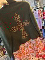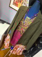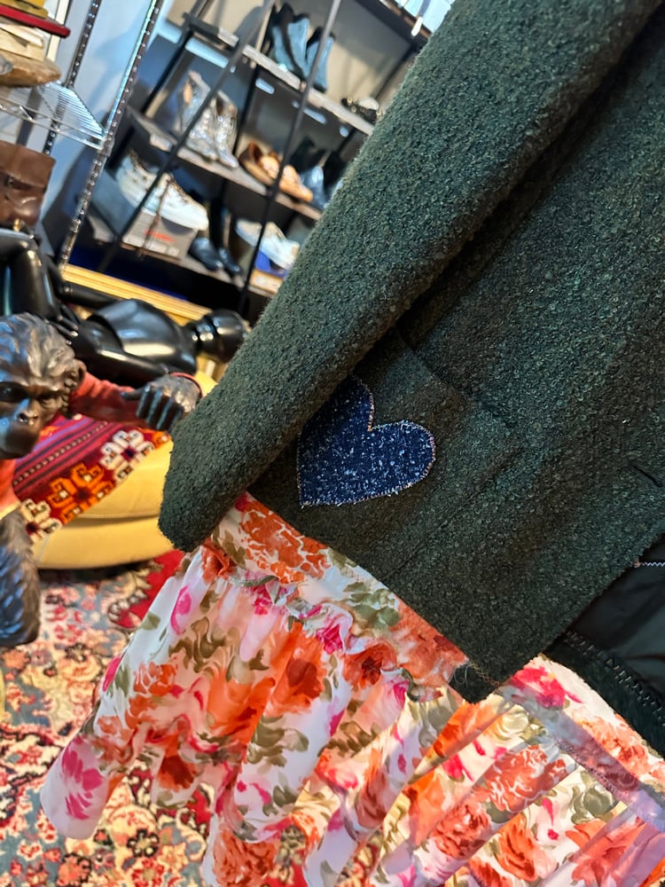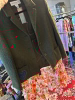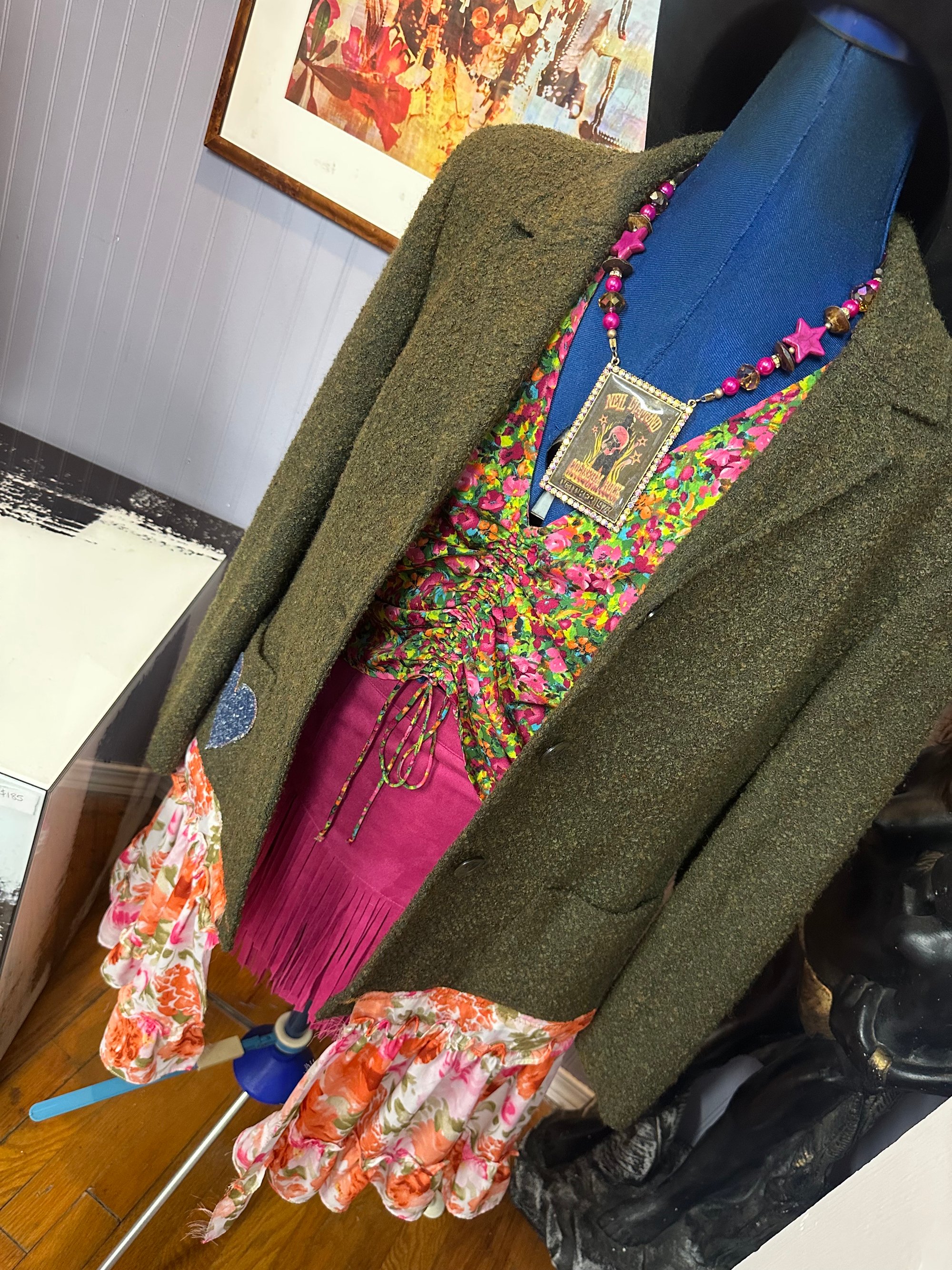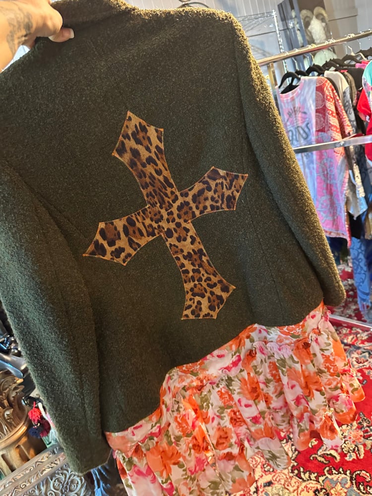 ONE OF A KIND STATEMENT BLAZER. OLIVE GREEN WITH A POP OF COLOR ALONG THE BOTTOM EDGE AND A GORGEOUS STITCHED CROSS ON THE BACK.