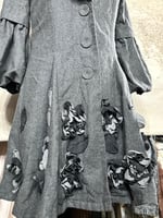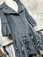This is a gray wool-blend jacket or coat from the brand Ryu, featuring a ruffled collar, flared sleeves, and 3D floral appliques.